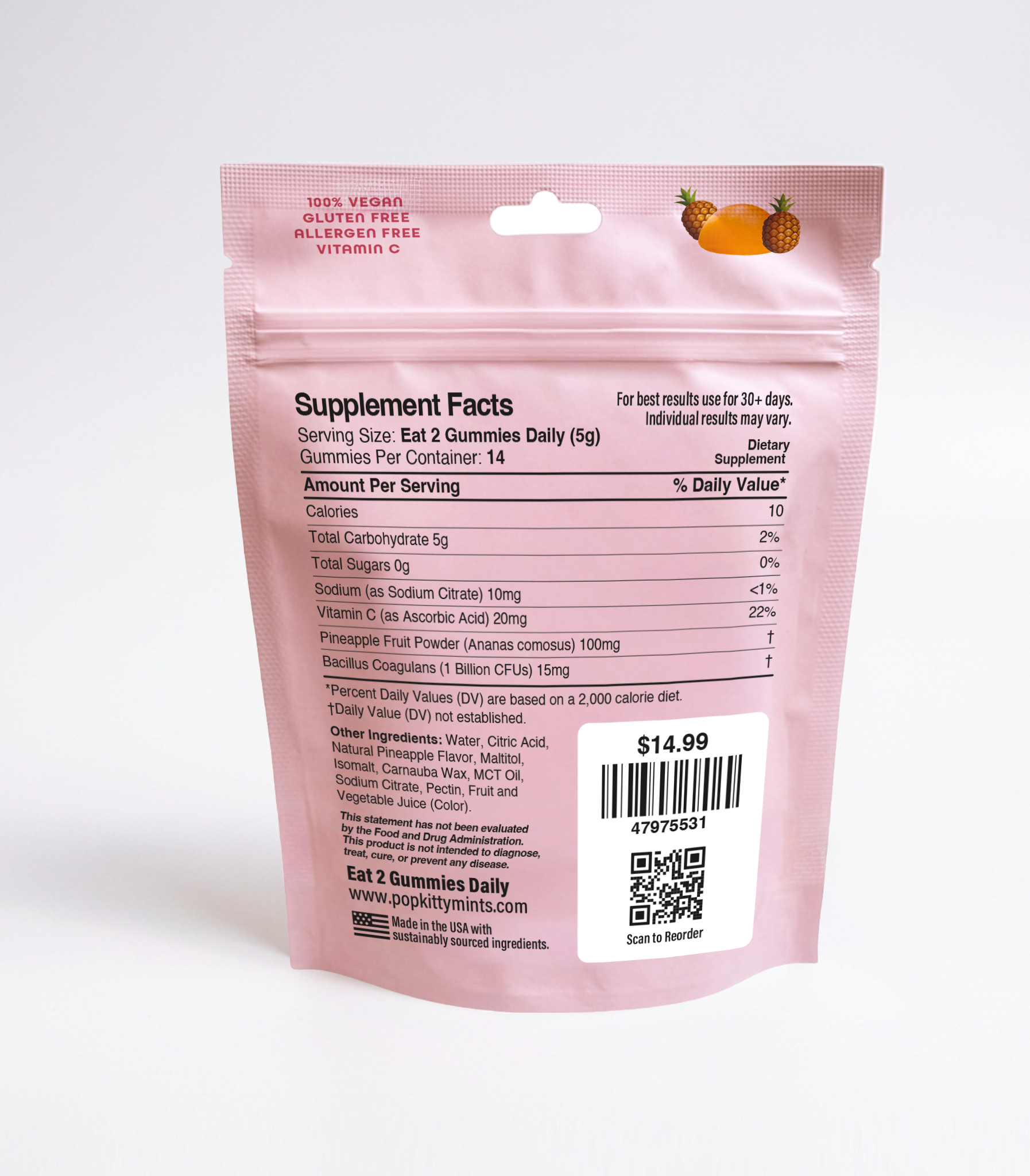This handy on-the-go travel pack is ideal for keeping in your purse, at your partner's house, or wherever you may stray. Each gummy is bursting with JUICY Pineapple 🍍deliciousness while delivering probiotics to support vaginal pH balance, flora, odor and taste.