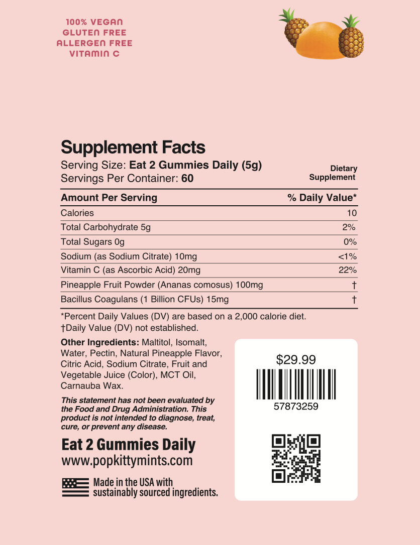 Our top seller, this 30-day supply of Kitty Mints™ Juicy Pineapple Gummies is designed for women ready to feel sexy, pHresh, and confident.